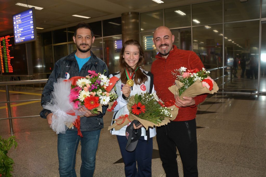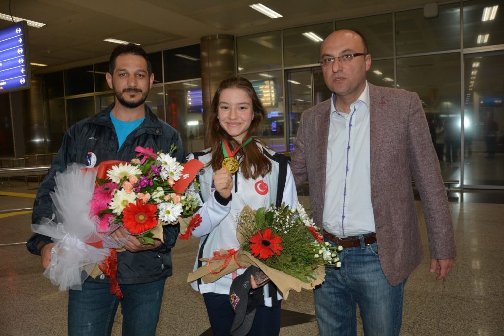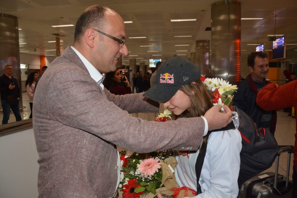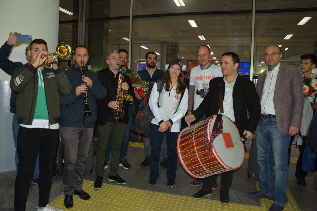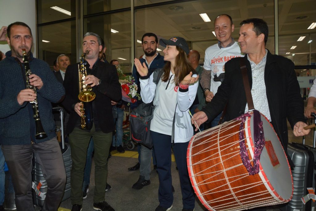 Portekiz’in Cantanhe’de kentinde düzenlenen Aerobik Cimnastik Dünya Kupası’nda ilk kez ‘Büyükler Tek Bayan Kategorisi’nde yarışan ve altın madalya kazanarak Dünya Kupası şampiyonu olan Manisa Büyükşehir Belediyespor’un “Altın Kız” lakaplı sporcusu Ayşe Begüm Onbaşı, dün gece Manisa Büyükşehir Belediyespor Yönetim Kurulu Üyesi Gökmen Aytaç, Manisa Cimnastik İl Temsilcisi Gökben Aygün Yetişen, Manisa Gençlik Spor İl Şube Müdürleri, şampiyon sporcumuzun babası Serkan Onbaşı ve Manisa Büyükşehir Belediyespor taraftarları tarafından İzmir Adnan Menderes Havaalanı’nda görkemli bir törenlekarşılandı. Dünya Kupası şampiyonu sporcumuz Ayşe Begüm Onbaşı ve Milli Takım Antrenörü Mehmet Ali Ekinci’nin apronda görülmesiyle birlikte büyük bir coşku yaşandı. Duygusal anların yaşandığı karşılama töreninde Onbaşı daha sonra “ Şampiyon” ve “ Türkiye” sloganları eşliğinde tek tek tebrikleri kabul etti. Dünya Kupası şampiyonumuz Ayşe Begüm Onbaşı’nın havaalanı çıkışı sonrasında ise davul, zurna eşliğinde oyunlar oynandı ve meşaleler yakıldı. İzmir Adnan Menderes Havaalanı’nda kendisi için düzenlenen görkemli karşılama töreninde oldukça duygulanan şampiyon sporcumuz Ayşe Begüm Onbaşı, “ Ay-yıldızlı bayrağımızı göndere çektirdiğim için gururluyum, mutluyum” dedi.