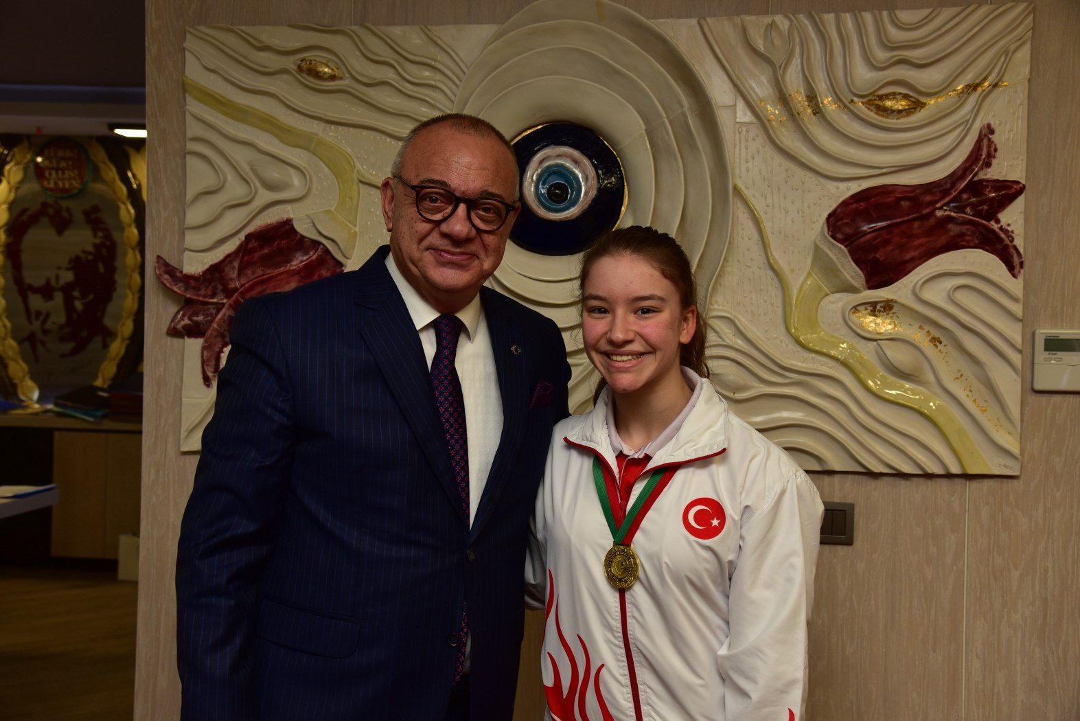 Manisa Büyükşehir Belediye Başkanı Cengiz Ergün, Portekiz’in Cantanhede kentinde düzenlenen Aerobik Cimnastik Dünya Kupası’nda ilk kez ‘Büyükler Tek Bayan Kategorisi’nde yarışan ve altın madalya kazanan Manisa Büyükşehir Belediyespor’un gururu Ayşe Begüm Onbaşı’yı makamında konuk etti ve tebrik etti. Onbaşı’ya Manisa Büyükşehir Belediyespor Yönetim Kurulu Üyesi Gökmen Aytaç, Milli Takım Antrenörü Mehmet Ali Ekin ve Cimnastik Şubesi Antrenörü Yasin Talay eşlik etti. Yeşil-beyazlı sporcunun milli takım formasıyla elde ettiği başarılar hakkında bilgi veren Manisa Büyükşehir Belediyespor Yönetim Kurulu Üyesi Gökmen Aytaç, Manisa Büyükşehir Belediye Başkanı Cengiz Ergün’e sporculara sağladığı destek nedeniyle teşekkür etti.