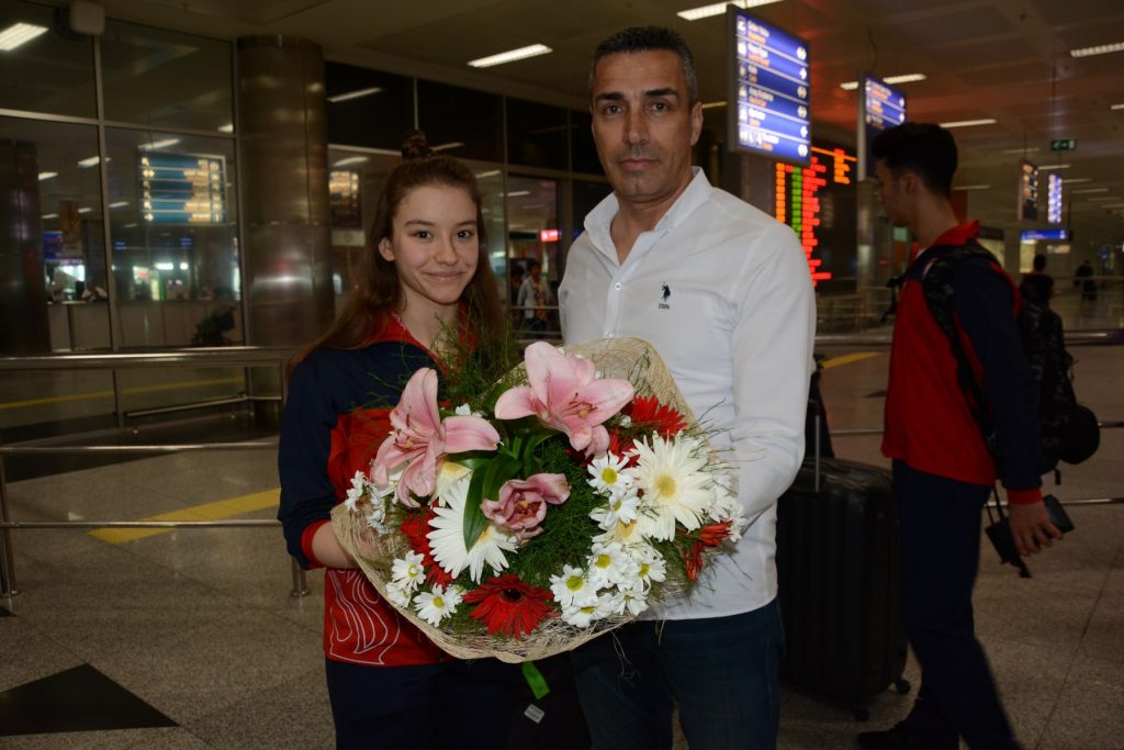 Azerbaycan’ın başkenti Bakü’de 24-26 Mayıs tarihleri arasında düzenlenen Aerobik Cimnastik Avrupa Şampiyonası’nda çiftler kategorisinde gümüş madalya kazanarak gururumuz olan Manisa Büyükşehir Belediyespor’un milli gururları Ayşe Begüm Onbaşı ve Mehmet Ercoş, yurda döndü. Sporcularımızı ve Milli Takım Antrenörü Mehmet Ekin’i İzmir Havaalanı’nda Manisa Büyükşehir Belediyespor Yönetim Kurulu Üyesi Özcan Nalbantlar, çiçeklerle karşıladı.