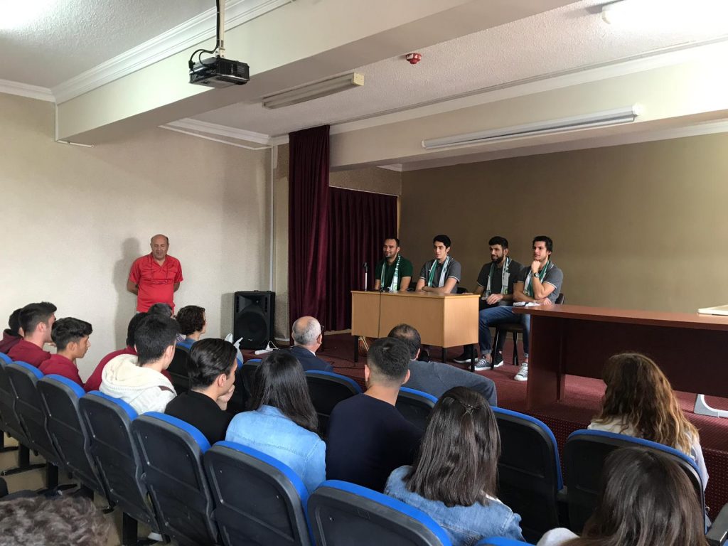 Türkiye Basketbol Ligi’nde 3.hafta mücadelesinde 26 Ekim Cumartesi günü saat 15.00’te Bandırma Kırmızı ile karşılaşacak olan Manisa Büyükşehir Belediyespor Basketbol Takımımızda Genel Menajerimiz İlhan Özsarı ve sporcularımızdan Burakcan Dilmaç, Özgür Şahin ve Tolga Kaan, Muradiye Toki Çok Programlı Anadolu Lisesi öğrencileriyle bir araya geldiler. Okul Müdürü Davut Özsarı ve öğrencilerle bir araya gelen dev adamlarımız, Cumartesi günü Muradiye Spor Salonu’nda konuk edecekleri Bandırma Kırmızı maçında öğrencilerden destek beklediklerini dile getirdiler.