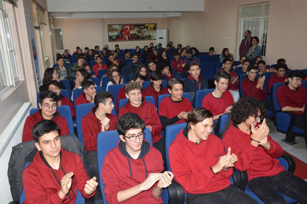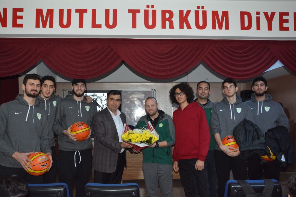 Baş Antrenörümüz Ceyhun Cabadak, İdari Menajerimiz İlhan Özsarı, basketbolcularımızdan Anıl Kubaliç, Burakcan Dilmaç, İbrahim Pınarer, Metehan Deniz ve Jesse Hunt, Dündar Çiloğlu Anadolu Lisesi’ni ziyaret etti. Okul Müdürü Fatih İnan Bozdemir ve öğretmenler tarafından karşılanan takımımız, toplantı salonunda öğrencilerle buluştu. Basketbola ve sezona ilişkin takımla ilgili tüm sorulara içtenlikle yanıt veren takımımız, özellikle iç saha maçlarında kendilerini yalnız bırakmayan Dündar Çiloğlu Anadolu Lisesi öğrencilerine teşekkür etti. 14 Aralık Cumartesi günü Muradiye Spor Salonu’nda oynanacak Finalspor karşılaşmasına davet eden dev adamlarımız, alkışlar eşliğinde okul ziyaretini tamamladı. Keyifli ve öğretici sohbet için takımımıza teşekkür eden Dündar Çiloğlu Anadolu Lisesi Müdürü Fatih İnan Bozdemir, Baş Antrenörümüz Ceyhun Cabadak’a çiçek takdiminde bulundu. Hatıra fotoğrafının çekilmesiyle, program sona erdi.