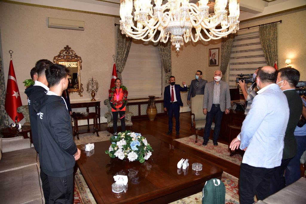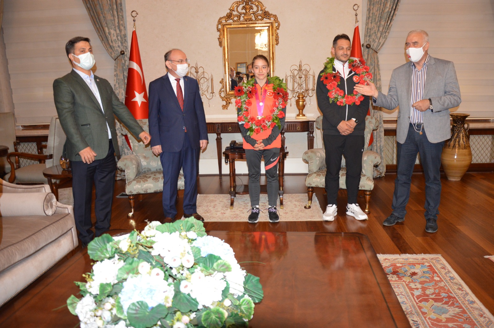 Azerbaycan’da düzenlenen Aerobik Cimnastik Dünya Şampiyonası’nda dünya şampiyonu olarak altın madalyayı ülkemize getiren Ayşe Begüm Onbaşı, Manisa’da coşkuyla karşılandı. Manisa Büyükşehir Belediyespor bünyesinden yetişen Ayşe Begüm Onbaşı ve takım arkadaşları ile antrenörleri Mehmet Ali Ekin’i, Manisa Valisi Yaşar Karadeniz makamında konuk etti. Ziyarette Manisa Büyükşehir Belediye Başkanvekili Mehmet Güzgülü, Manisa Büyükşehir Belediyespor Yönetim Kurulu Üyesi Gökmen Aytaç ile Gençlik ve Spor İl Müdürü Yunus Öztürk de yer aldı. Ayşe Begüm Onbaşı’nı tebrik eden Manisa Valisi Yaşar Karadeniz, Onbaşı, takım arkadaşları ve antrenörü Mehmet Ali Ekin’i tebrik etti. Manisa Büyükşehir Belediye Başkanvekili Mehmet Güzgülü de şampiyon sporcu Ayşe Begüm Onbaşı ve antrenörü Mehmet Ali Ekin’i tebrik ederek, altın hediye etti. Manisa Büyükşehir Belediyespor Yönetim Kurulu Üyesi Gökmen Aytaç da, Büyükşehir Belediyespor adına dünya şampiyonu Ayşe Begüm Onbaşı’ya hediye takdim etti.