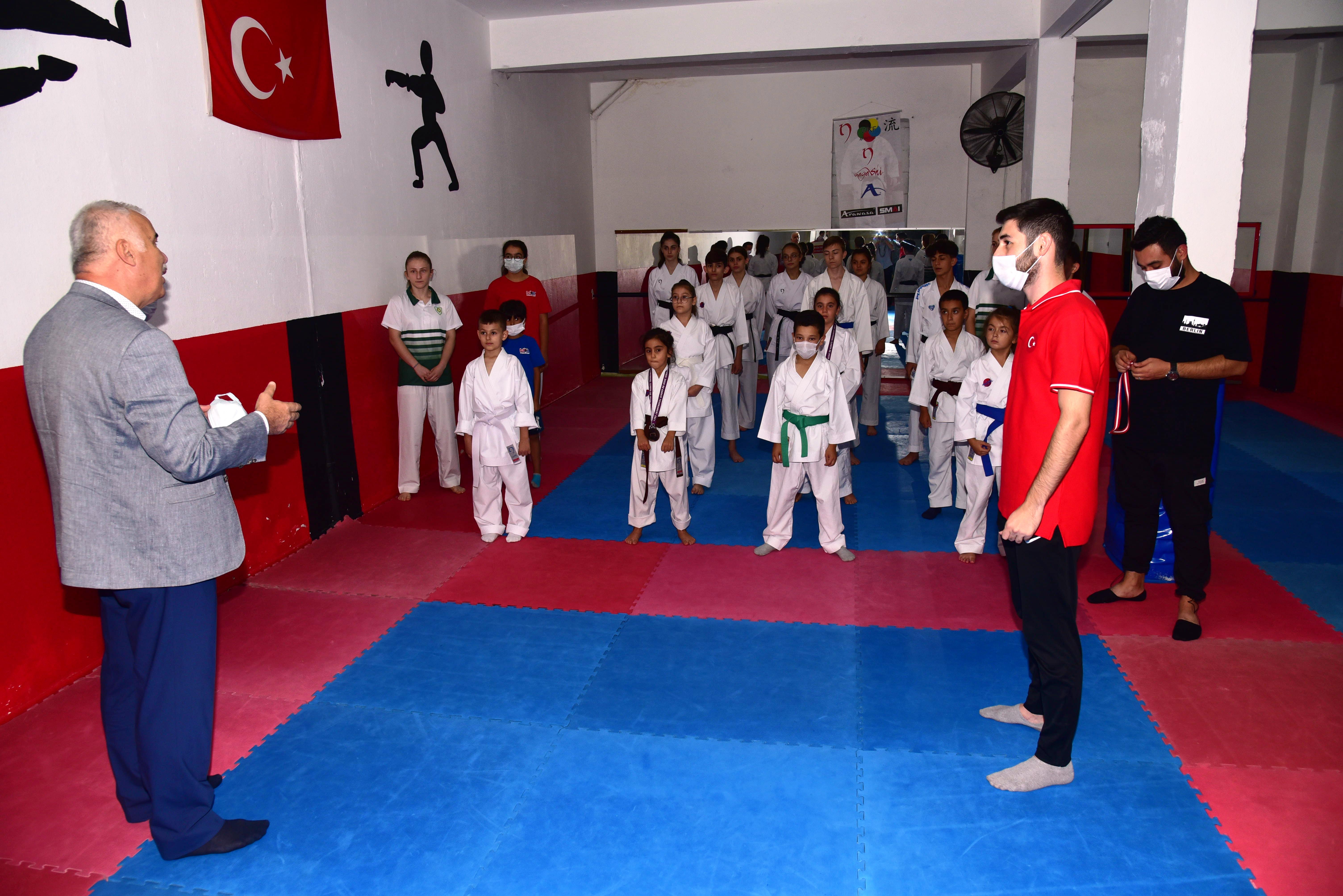 Manisa Büyükşehir Belediyespor Başkanı Mehmet Güzgülü, Yönetim Kurulu Üyesi Engin Altun ile birlikte antrenör Ali Eşsiz eşliğinde çalışmalarını sürdüren karate takımını ziyaret etti. Kulüp bünyesine yeni katılan karate branşında kısa sürede önemli başarılara imza atıldığını dile getiren Mehmet Güzgülü, sporcularımıza çalışmalarında başarılar diledi.