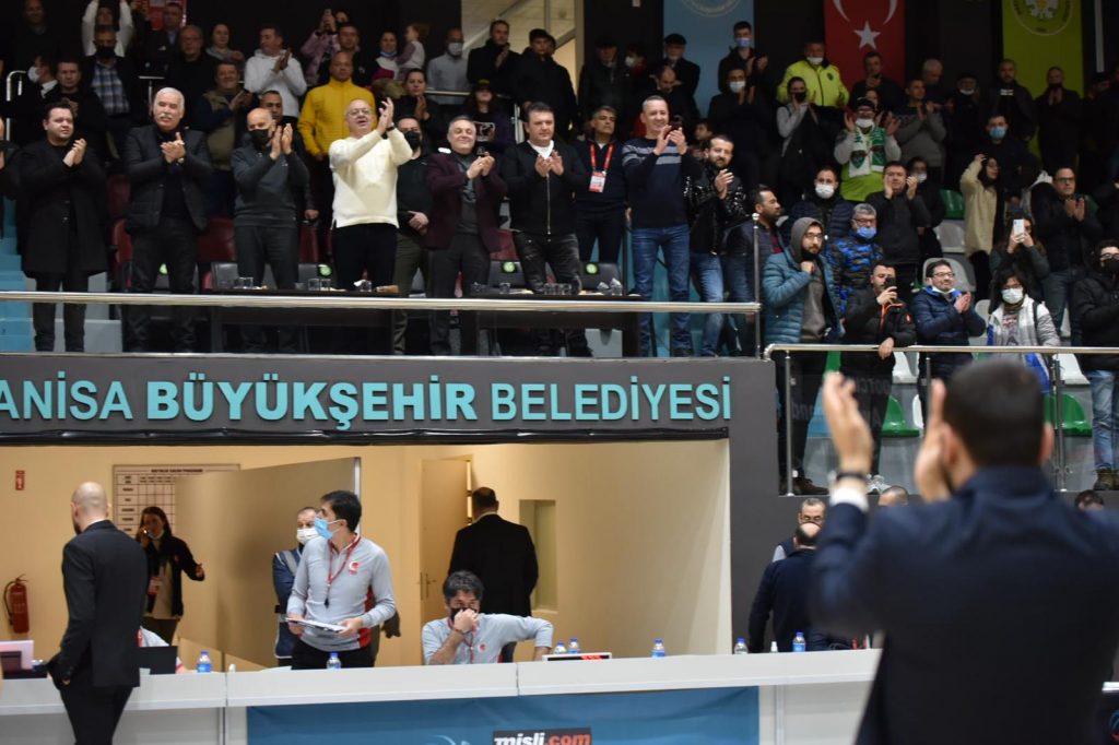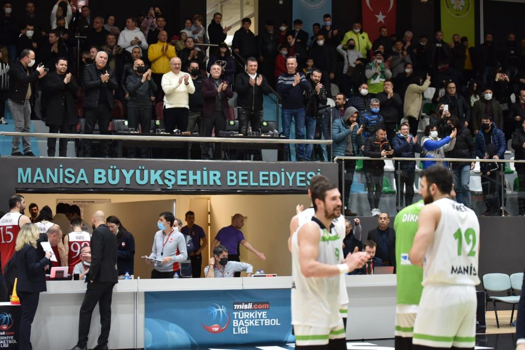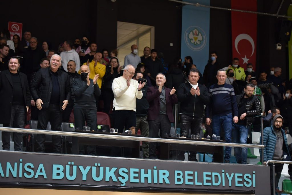Türkiye Basketbol Ligi’nde şampiyonluk yolunda başarılı sonuçlarına devam eden Manisa’nın yeşil-beyazlı dev adamları Tarık Almış Spor Salonu’nda Mersin Büyükşehir Belediyespor’u ağırladı. Karşılaşmayı Büyükşehir Belediye Başkanı Cengiz Ergün, MHP Manisa İl Başkanı Murat Öner, Büyükşehir Belediyespor Kulüp Başkanı Mehmet Güzgülü, Manisa FK Kulüp Başkanı Mevlüt Aktan, Basketbol Şube Sorumlusu Bora Çaylan, Yönetim Kurulu Üyeleri, Büyükşehir Belediyesi Genel Sekreter Yardımcısı Ali Öztozlu, MASKİ Genel Müdür Yardımcısı Erman Aydınyer, Manisa FK teknik yönetimi ve oyuncuları da tribünde takip etti.