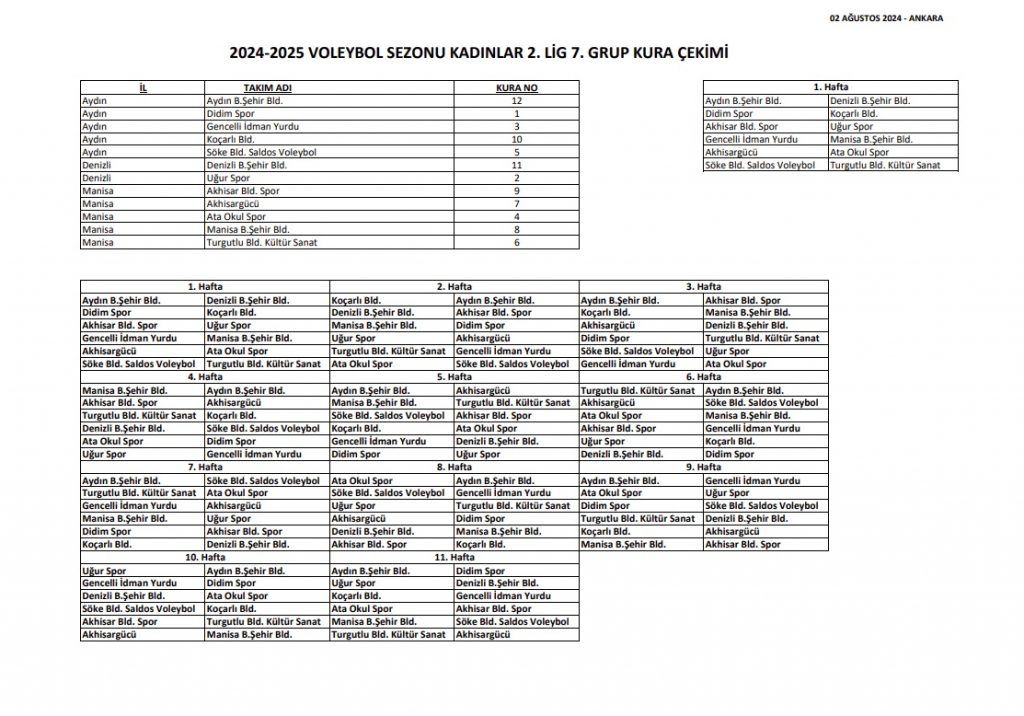 Türkiye Voleybol Federasyonu (TVF) 2. Liglerinde 2024-2025 voleybol sezonunun fikstür çekimi, Türkiye Voleybol Federasyonu’nun Ankara Merkez Ofisi’nde yapıldı. Kura çekimini, TVF Lig İşleri Danışmanı Recep Nurtanış ve TVF Lig İşleri Sorumlusu Ebru Ezgi Alper gerçekleştirdi. Kura çekimine Manisa Büyükşehir Belediyespor Yönetim Kurulu Üyeleri Murat Kümüştekin, Nabi Başbay ve Doğan Kırdağ da katıldı. Manisa Büyükşehir Belediyespor, sezona Aydın deplasmanında başlayacak. Yeşil-beyazlılar, ilk maçında Gencelli İdmanyurdu ile karşı karşıya gelecek. Türkiye Voleybol 2. Ligi’nde sezon 6 Ekim 2024 tarihinde oynanacak maçlarla başlayacak. 1 Aralık 2024 tarihinde oynanacak maçlarla devre arasına girilecek. Ligin ikinci yarısı 8 Aralık 2024 tarihinde başlayacak ve normal sezon 26 Ocak 2025 tarihinde son bulacak.