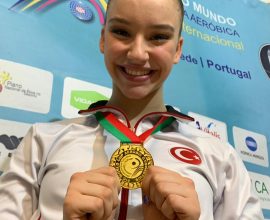 Manisa Büyükşehir Belediyespor’un Altın Kızı Ayşe Begüm Onbaşı, Portekiz’in Cantanhe’de kentinde düzenlenen Aerobik Cimnastik Dünya Kupası’nda Büyükler Tek Bayanlar kategorisinde